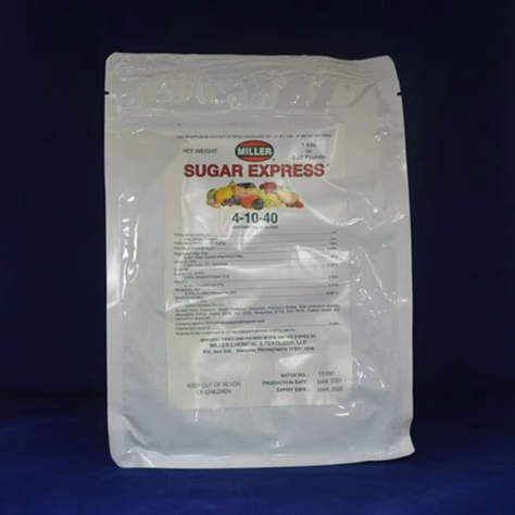 Sugar Express® 4-10-40 es un fertilizante altamente refinado con la proporción adecuada de fósforo y potasio diseñado para usarse cerca de la cosecha. Sugar Express es un fertilizante foliar de primera calidad, único en el mercado y ofrecido exclusivamente por Miller. Este producto fertilizante soluble en agua está diseñado para usarse en la mayoría de los cultivos, mejorando el vigor de las plantas y promoviendo la producción de cultivos mediante la suplementación de los requisitos de nutrientes necesarios.